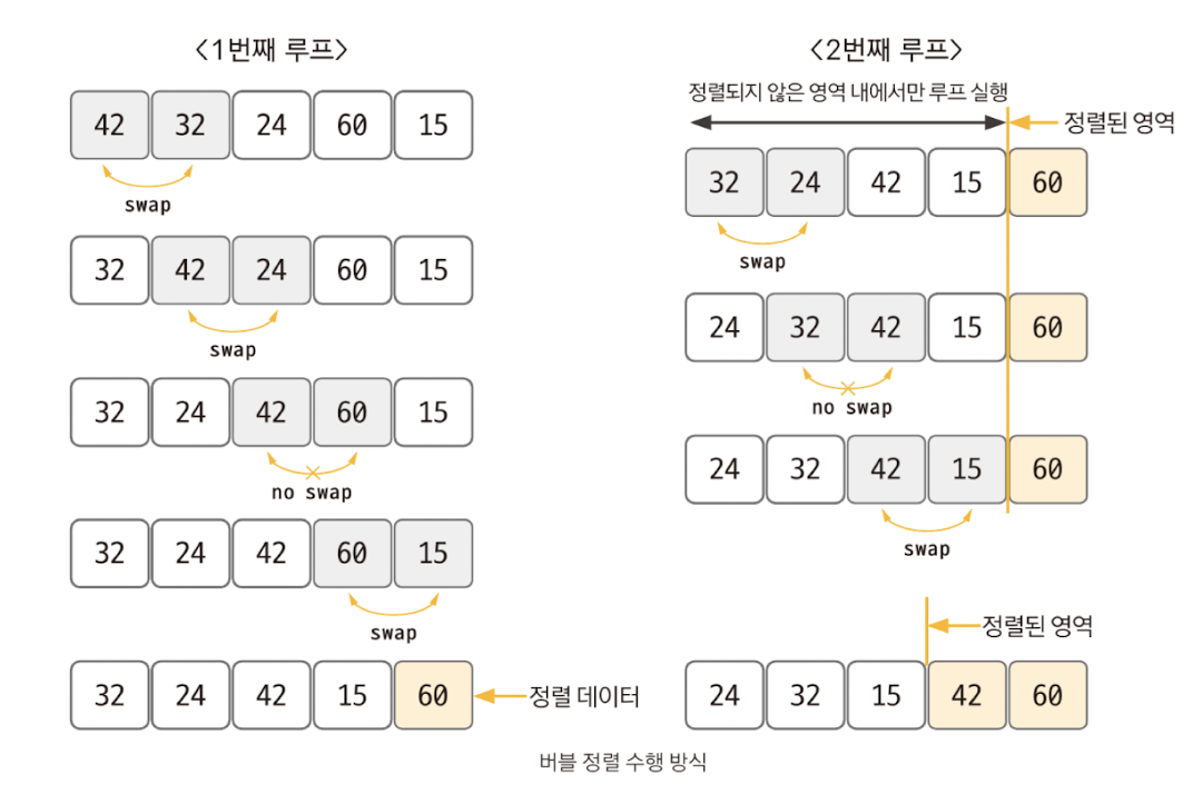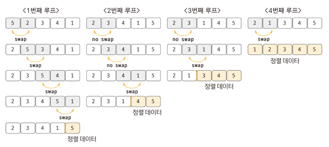 | 버블 (bubble) | 데이터의 인접 요소끼리 비교하고, swap 연산을 수행하며 정렬하는 방식 |