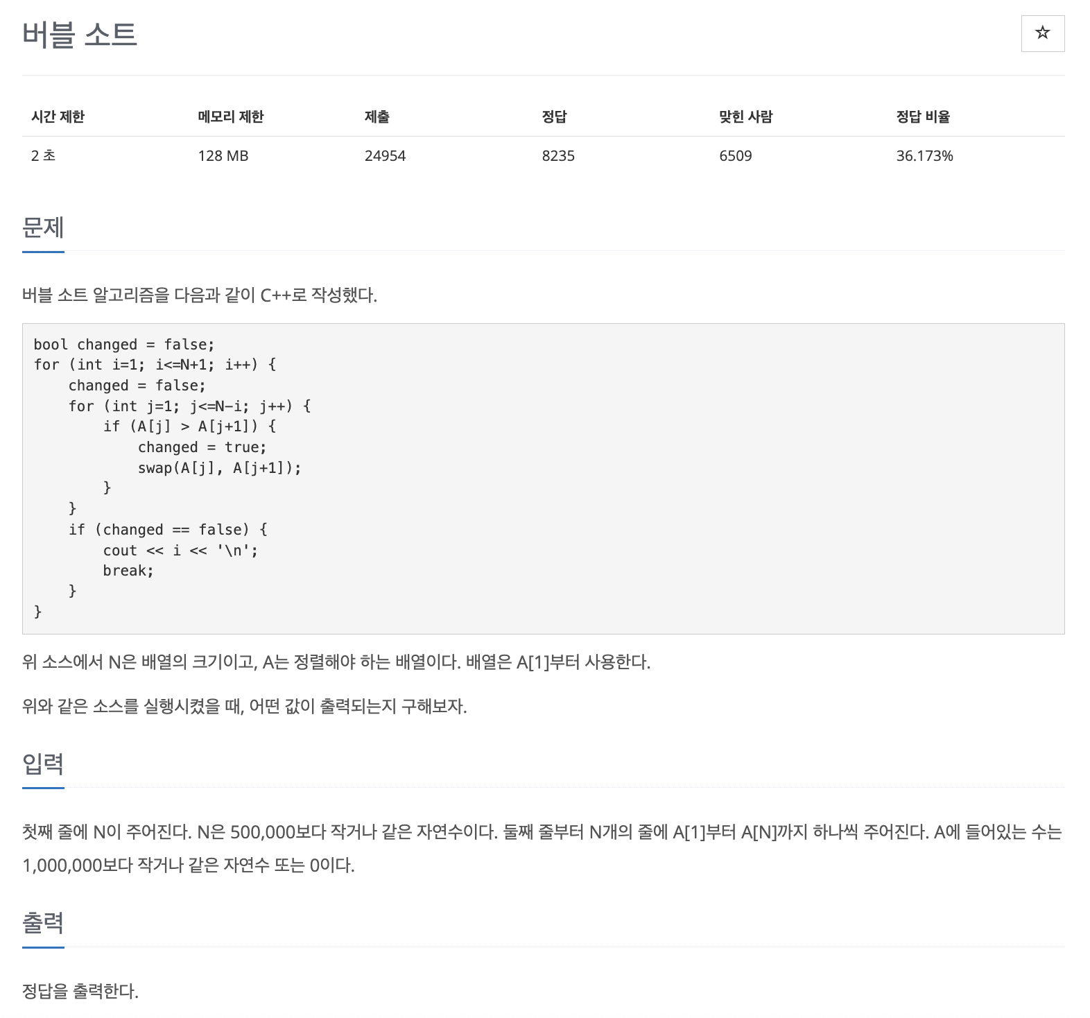 - 버블 정렬의 swap이 한 번도 일어나지 않은 루프가 언제인지 알아내는 문제
