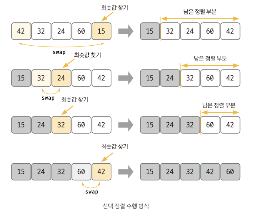 - 최솟값 또는 최댓값을 찾고, 남은 정렬 부분의 가장 앞에 있는 데이터와 swap하는 것이 선택 정렬의 핵심