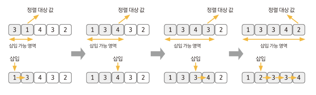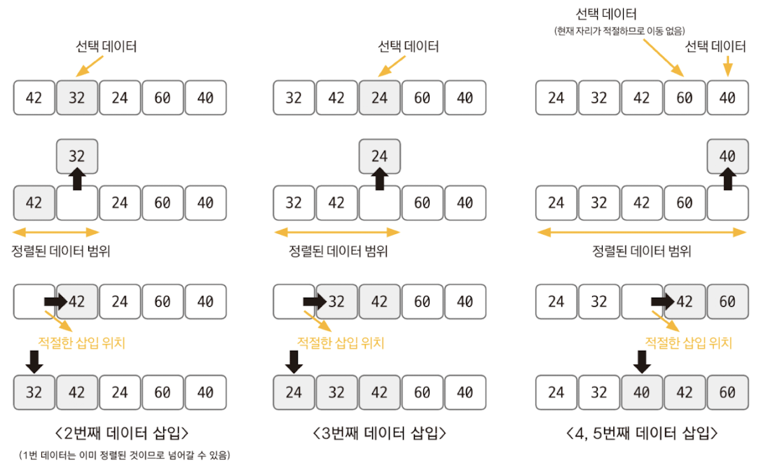 - 삽입 정렬은 이미 정렬된 데이터 범위에 정렬되지 않은 데이터를 적절한 위치에 삽입시켜 정렬하는 방식